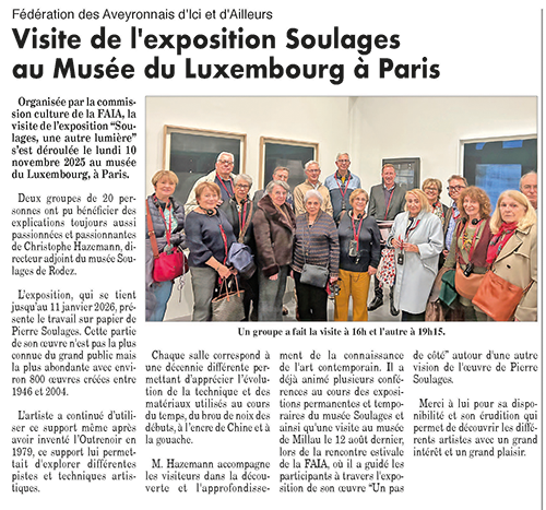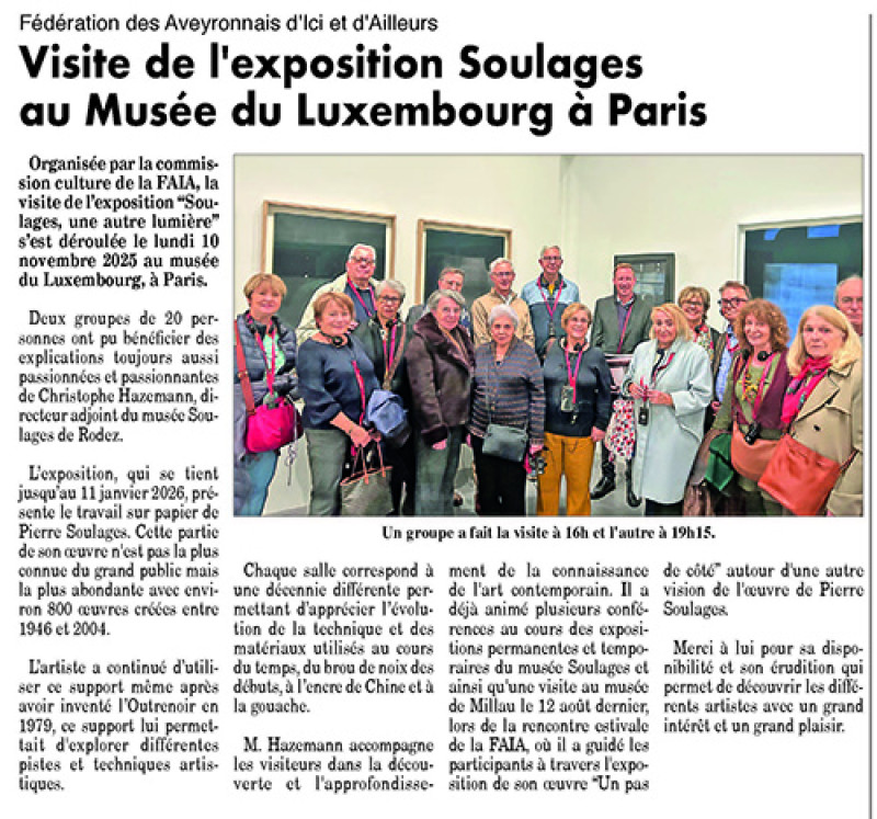 Organisée par la commission culture de la FAIA, la visite de l’exposition « Soulages, une autre lumière » s’est déroulée le 10 novembre 2025 au Musée du Luxembourg à Paris.