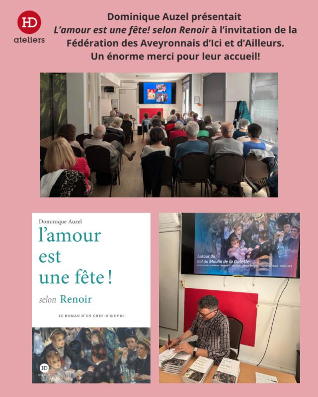 Le 17 avril 2026, la Fédération des Aveyronnais d'Ici et d'Ailleurs a accueilli un public nombreux pour un déjeuner‑conférence consacré à « L’Amour est une fête » selon Renoir, présenté par l’écrivain et spécialiste Dominique Auzel. Cette rencontre, organisée dans le 11ᵉ arrondissement de Paris, a offert un moment riche en échanges autour de l’œuvre du peintre.