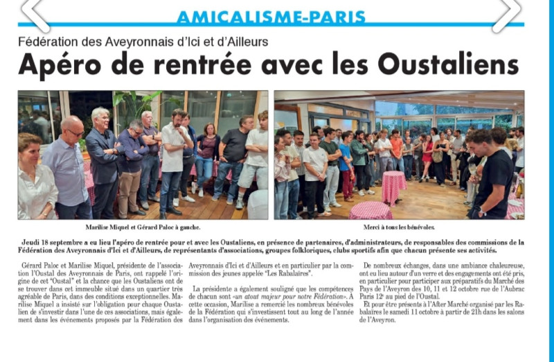 Jeudi 18 septembre 2025 a eu lieu l’Apéro de rentrée pour et avec les Oustaliens, en présence de partenaires, d’administrateurs, de responsables des commissions de la Fédération des Aveyronnais d’Ici et d’Ailleurs, de représentants d’associations, groupes folkloriques, clubs sportifs afin que chacun présente ses activités. Gérard Paloc et Marilise Miquel, Présidente de l’association l’Oustal des Aveyronnais de Paris, ont rappelé l’origine de cet « Oustal » et la chance que les oustaliens ont de se trouver dans cet immeuble situé dans un quartier très agréable de Paris dans des conditions exceptionnelles. Marilise Miquel a insisté sur l’obligation pour chaque oustalien de s’investir dans l’une de ces associations, mais également dans les évènements proposés par la Fédération des Aveyronnais d’Ici et d’Ailleurs et en particulier par la commission des jeunes appelée « Les Rabalaïres ».