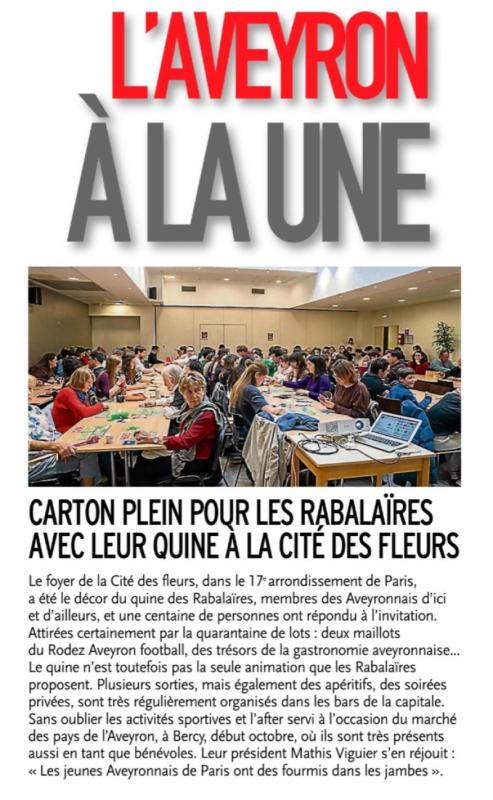L’association des Rabalaires, commission regroupant à Paris les Jeunes de l’Aveyron ou d'origine Aveyronnaise de la Fédération des Aveyronnais d’Ici et d’Ailleurs, a organisé son traditionnel quine annuel, le dimanche 25 janvier dernier, au Foyer des Jeunes Travailleurs (FJT) de la Cité des Fleurs. Les membres de la Résidence, située dans le 17e, ont apporté leur aide à l’organisation. Au menu des lots : les mets aveyronnais ou deux maillots du Rodez Aveyron Football (RAF)…
