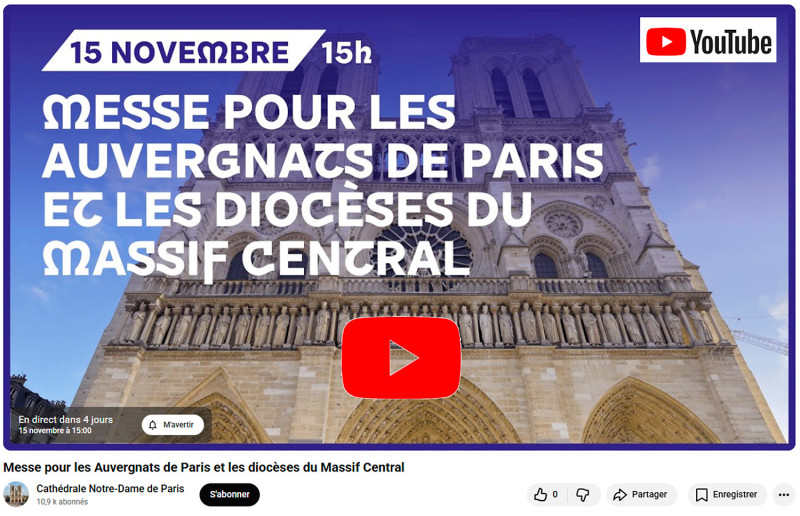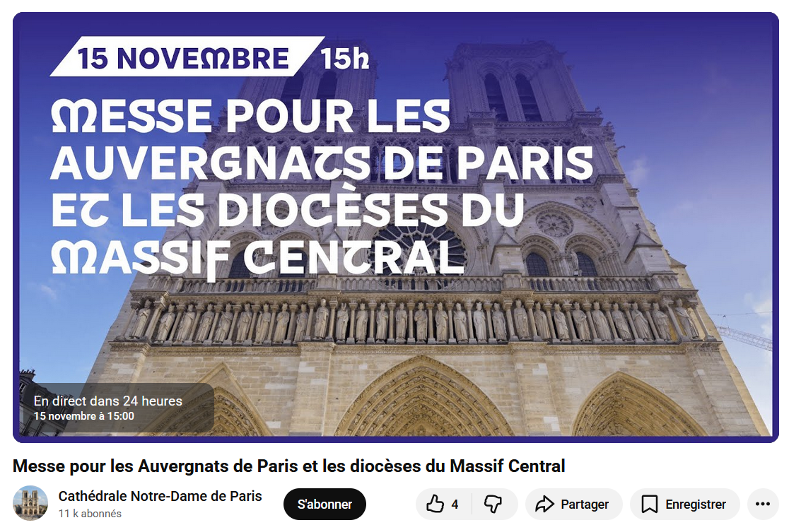 15 NOVEMBRE 2025 - MESSE A LA CATHEDRALE NOTRE DAME DE PARIS - Retransmission en direct - messe pour les Auvergnats de Paris et les diocèses du Massif Central