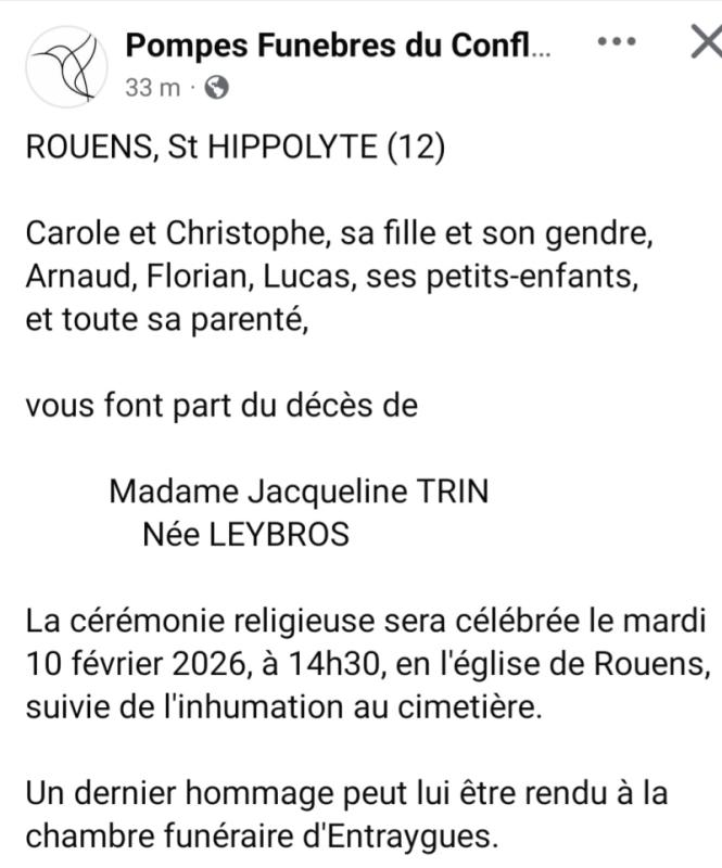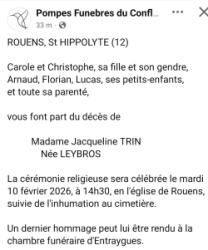 Nous vous informons du décès de Madame Jacqueline TRIN LEYBROS survenu le mardi 3 février.