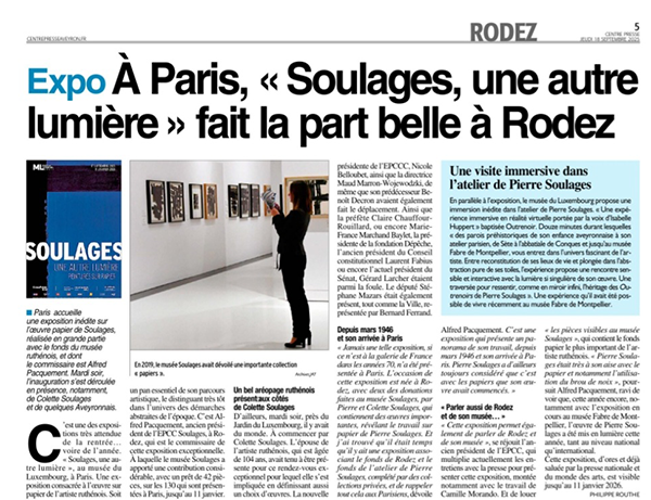 Exposition Soulages au Musée du Luxembourg du 16 septembre 2025 au 11 janvier 2026 - Article Centre Presse du 18 septembre 2025